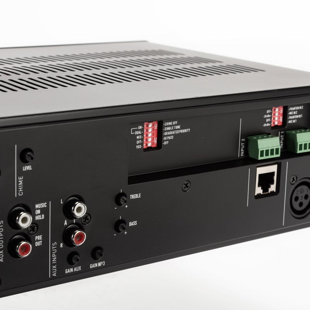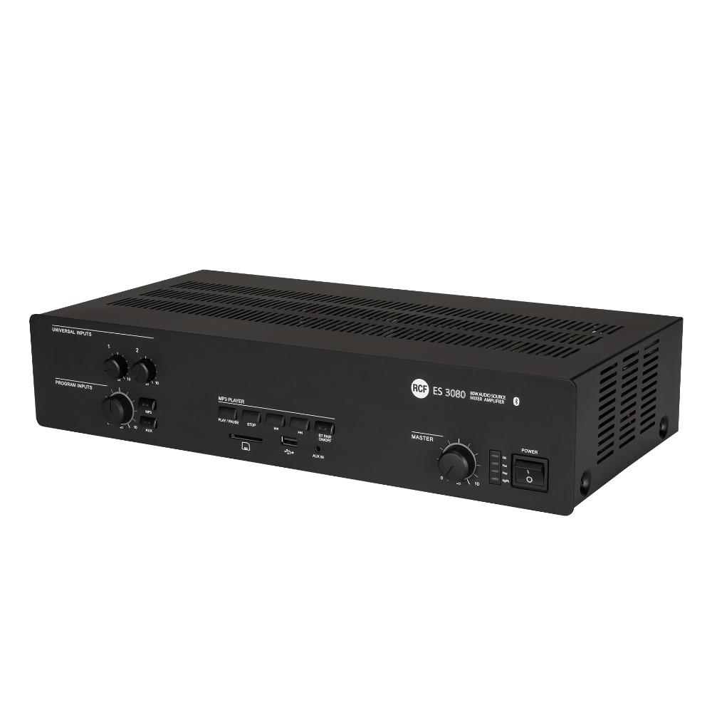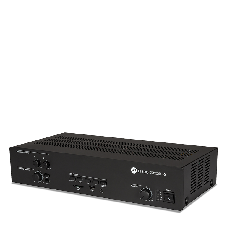ES 3080 is an 80 W mixer-amplifier with a MP3 player directly accessible on the front panel. It can read USB sticks, SD cards, has an auxiliary input port with 3.5mm jack and Bluetooth technology for the connection with external sources. Moreover, it offers 2 mic-line audio inputs on removable connectors (the first input also has an XLR socket). Input 2 also has an RJ 45 port for quick connection of an RCF BM 3001 paging microphone (through CAT5 cable). The amplifier output is available either for low impedance speakers (min. 4 O) or 100 – 70 V constant voltage line (for speakers having 100 – 70 V transformers). Input 1 has a signal detection circuit (‘VOX’) for automatic priority. Inputs 1 and 2 can access the priority through an external command (connected to either the removable connector or the RJ 45 port). The MUSIC ON HOLD output directly sends the internal MP3 player signal to additional amplifiers, mixers, phone systems (‘music on hold’ function), etc. The PRE OUT output sends the signal (the same routed to the internal amplifier) to additional amplifiers. The 2 mic-line inputs have a high-pass filter (with a common on/off dip-switch) that are useful to improve speech intelligibility. The internal MP3 player and the AUX INPUT have tone controls (common for both). Front panel LEDs indicate the device state (ON, PROT), priority circuit enabled (PRIOR) and the signal level / peak (SIG/PK).