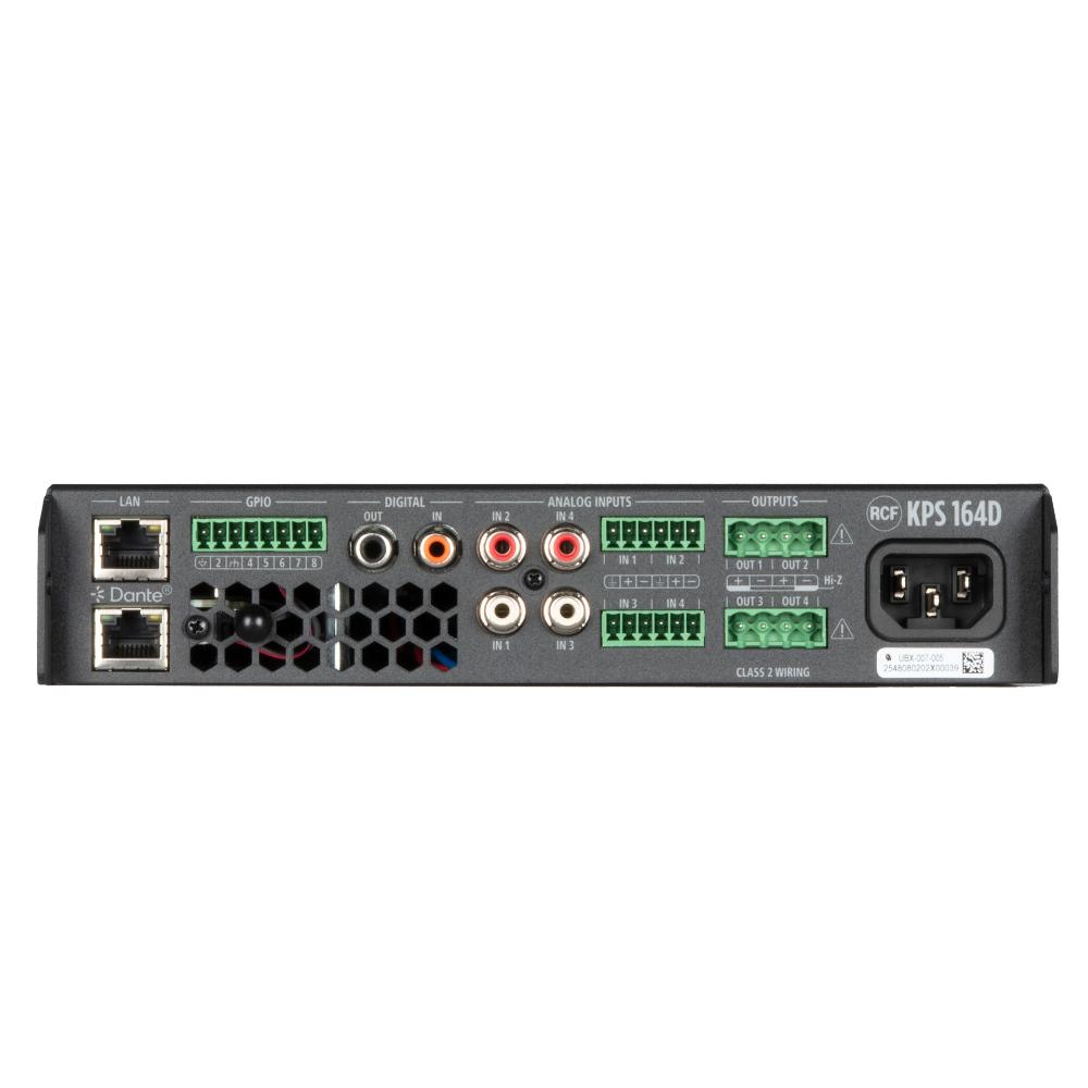 KPS 164D is a professional 4-channel amplifier with a total output power of 640 W, designed for high-demanding audio installations where flexibility, reliability, and advanced control are essential. Equipped with Class-D amplification and integrated DSP, it provides complete and accurate signal processing, with intuitive configuration through RCF's RDSpace software. The library of RCF loudspeakers’ presets simplifies the setup and ensures optimal performance. Native Ethernet connectivity makes it ideal for distributed systems with independent zone control, while the integrated wireless access point allows direct connection with mobile devices. Equipped with Audinate Dante™ AoIP networks interface, allowing the distribution of 4 digital audio channels.