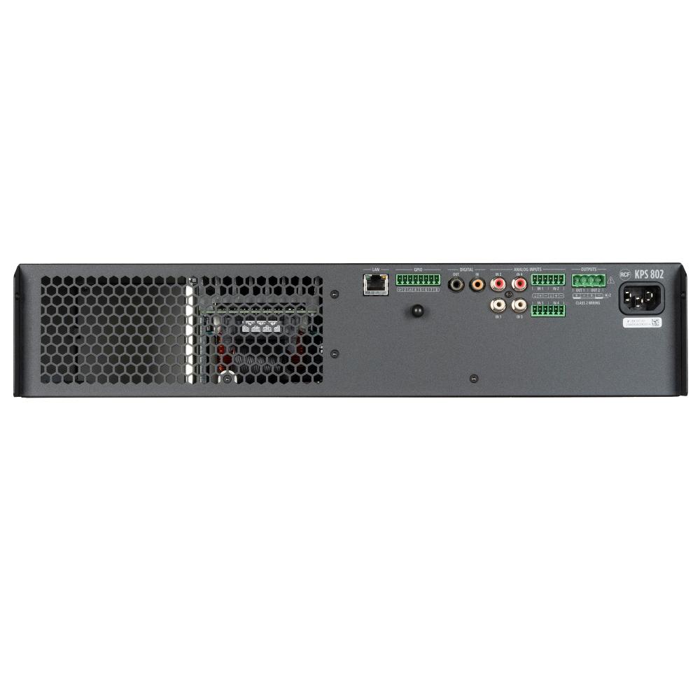 KPS 802 is a professional 2-channel amplifier with a total output power of 1600 W, designed for high-demanding audio installations where flexibility, reliability, and advanced control are essential. Equipped with Class-D amplification and integrated DSP, it provides complete and accurate signal processing, with intuitive configuration through RCF's RDSpace software. The library of RCF loudspeakers’ presets simplifies the setup and ensures optimal performance. Native Ethernet connectivity makes it ideal for distributed systems with independent zone control, while the integrated wireless access point allows direct connection with mobile devices.