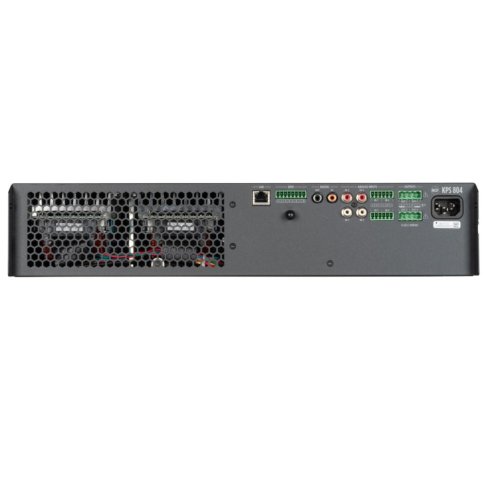 KPS 804 is a professional 4-channel amplifier with a total output power of 3200 W, designed for high-demanding audio installations where flexibility, reliability, and advanced control are essential. Equipped with Class-D amplification and integrated DSP, it provides complete and accurate signal processing, with intuitive configuration through RCF's RDSpace software. The library of RCF loudspeakers’ presets simplifies the setup and ensures optimal performance. Native Ethernet connectivity makes it ideal for distributed systems with independent zone control, while the integrated wireless access point allows direct connection with mobile devices.