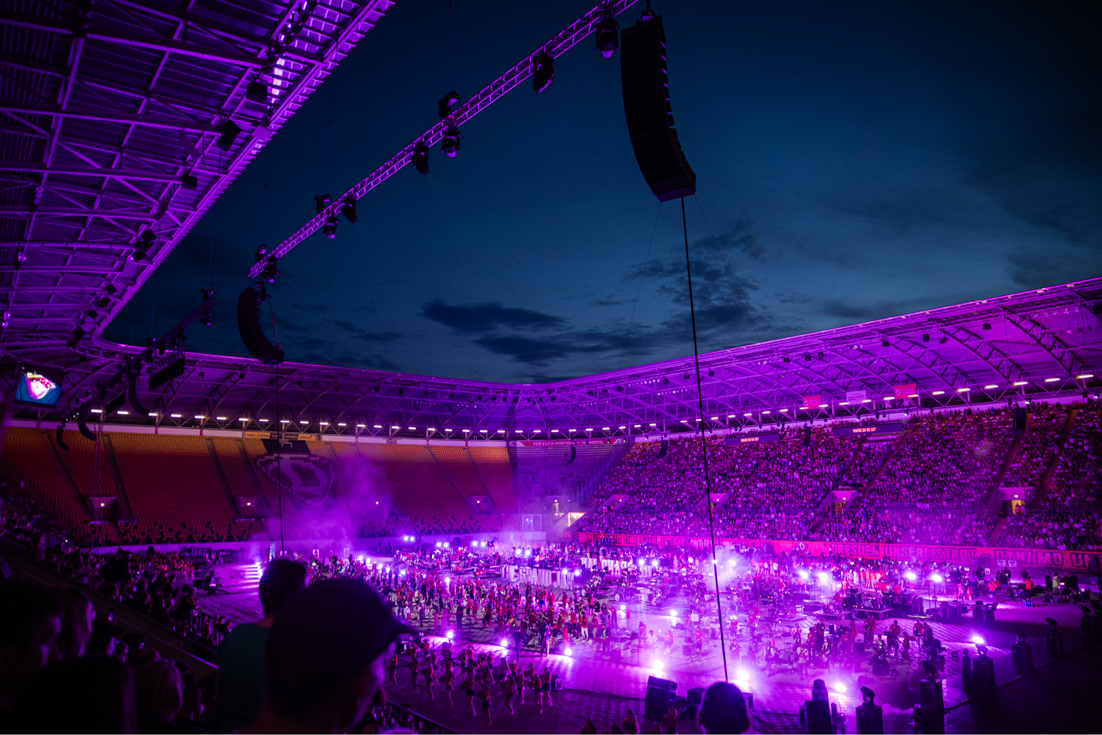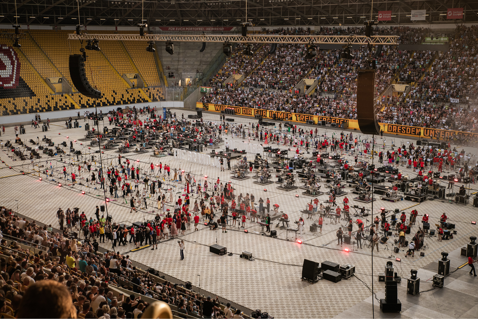 Dresden, Germany - More than 1,000 musicians performed before 15,000 fans at Rudolf-Harbig-Stadion, in what organizers billed as the largest TT+ Audio’s GTX System deployment in Germany to date. The Grand Jam 2025 united all musicians across two stages, positioned on the west and main grandstands, to form a single, immense orchestra that captivated and moved the audience.